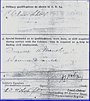 This second page has been completed as follows : Military Qualifications: '1st Class Shot' ; Special Remarks as to qualifications , work done or skill acquired: 'France 4 Months Wounded Once'. (A shell exploded behind him, leaving him with a shrapnel wound in the back of his head, below the left ear.)